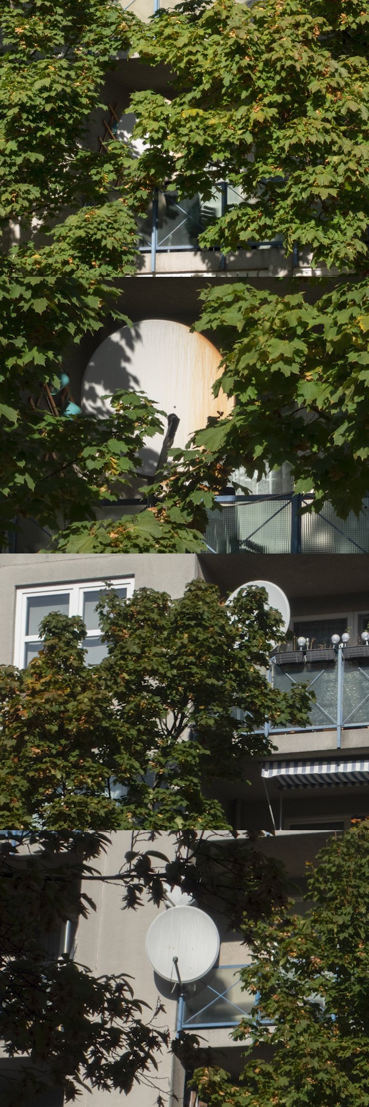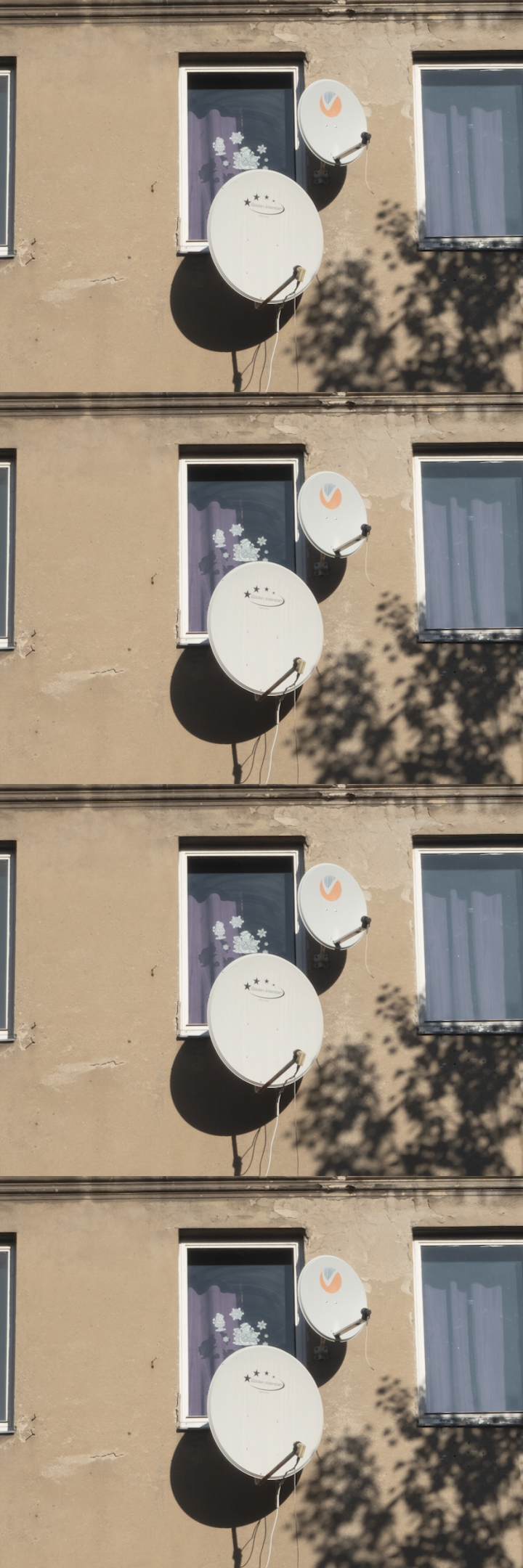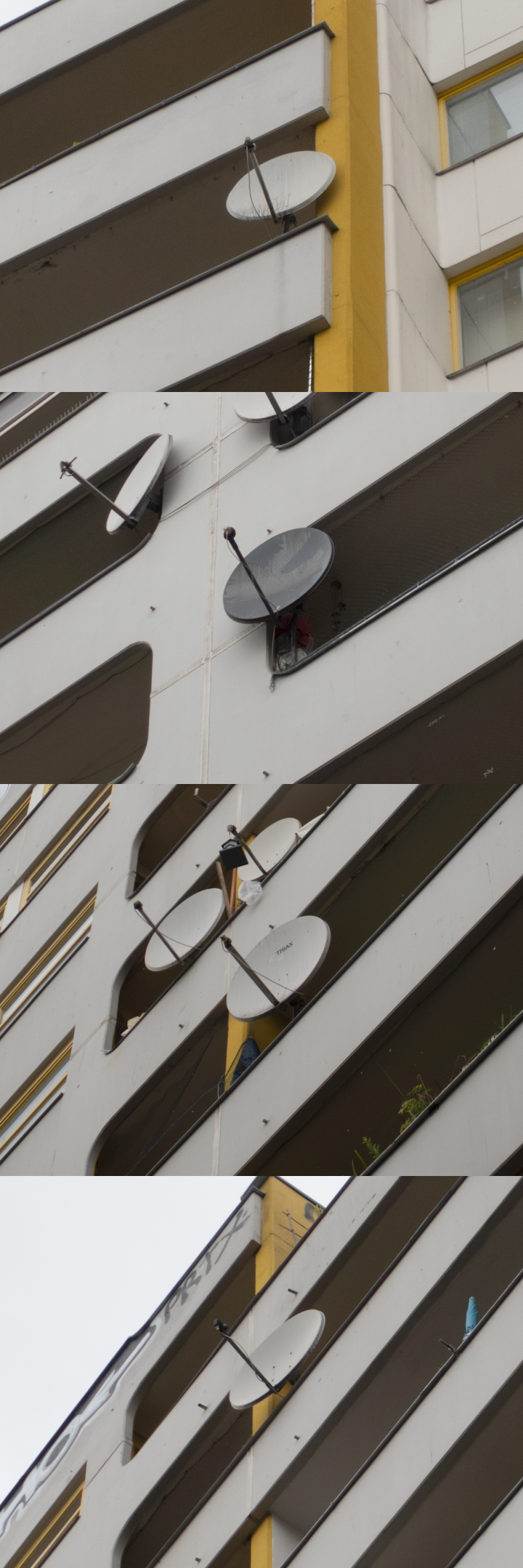 Photographs of satellite dishes taken on the streets of Berlin, Germany in 2023.